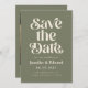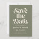 Retro y elegante salva la carta de fecha con el tipo de letra boho que dice "salva la fecha" en color verde oliva. Puede añadir una foto en la parte posterior.