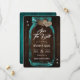 Tarjeta de aviso de boda rústica azul teal con un frasco de albañil y corazones de arpillera contra un fondo de madera de granero adornado con luces centelleantes. Personalice fácilmente esta tarjeta de aviso de boda rústica romántica azul teal en línea. Artículos coincidentes disponibles para complementar esta tarjeta de aviso de boda azul teal.