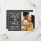 Un audaz guardar la fecha con pizarra con un llamativo diseño de panel dividido: tipografía mixta de efecto de tiza expresivo a la izquierda y una foto personalizada de cuerpo entero a la derecha. La estética juguetona de letra a mano da a este diseño un ambiente cálido y personal, aunque sigue luciendo refinado. Nombres, fecha y todos los demás detalles totalmente editables.