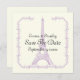 Boda de París Torre Eiffel luz morada Guardar anuncio de fecha. Un diseño elegante, lleno de clase y finura, con la Torre Eiffel en violeta clara en un borde adamascado de marfil.