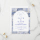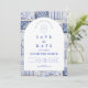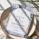 Un diseño atemporal en azul y blanco inspirado en la porcelana clásica de Delft y los patrones de toile franceses. El borde de baldosas de patchwork combina delicadas flores, rayas y motivos ornamentales que evocan cerámicas europeas vintage. Un suave panel arqueado en el centro mantiene el diseño refinado y elegante, permitiendo que los detalles del patrón inspirado en la porcelana enmarquen la celebración de manera hermosa. Perfecto para parejas que planean una boda sofisticada en azul y blanco con encanto europeo tradicional.