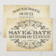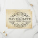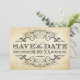 Las torbellinas negras y los floridos marcos de esta elegante boda de inspiración vintage ahorran el diseño de la invitación de fecha con detalles adicionales de la redacción en el reverso. El fondo rústico de marfil está impreso con un papel de pergamino envejecido en textura.