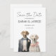 Ilustración caprichosa del perro del novio con traje elegante y el perro de la novia con lazo rosa