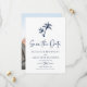 Esta simple boda tropical de playa mínima, salvo la tarjeta de fecha, cuenta con dos palmeras en la parte superior, con texto clásico y elegante, en un esquema de color blanco y azul marino, con una plantilla de fotos en la parte posterior.