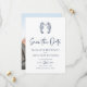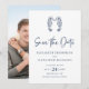 Esta clásica tarjeta blanca y azul marino minimalista de guardar la fecha de la boda es perfecta para bodas temáticas costeras y náuticas y de destino de playa, con 2 adorables caballitos de mar besándose en la parte superior, letra manuscrita trendy y una plantilla de foto en la parte posterior.