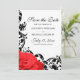 Elegantes save the dates de boda con rosa roja. Con una clásica rosa roja con elegantes floreos negros en espiral sobre un fondo blanco. Floreos por Mujka Design
