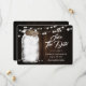 Bodas rústicas salvan la tarjeta de cita con un frasco de albañil y corazones de bupón contra un fondo de madera de granero adornado con luces de cuerda. Personalice fácilmente esta romántica boda rústica, salve la fecha en línea. Artículos de juego disponibles para complementar esta boda rústica de campo salven la fecha.