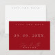 Anuncie su historia de amor con sofisticación atemporal a través de nuestra Simple Crimson Red y White Minimal Typography Wedding Save the Date cards. Con un diseño clásico y elegante, estas tarjetas captan la esencia de la sencillez y el minimalismo de la moda, presentando una combinación perfecta de encanto tradicional y estilo contemporáneo. La estética oscura de la paleta roja y blanca resalta el encanto dramático, creando un toque romántico que se asemeja a los gustos modernos. Abraza el poder de la tipografía, ya que cada letra está delicadamente elaborada, transformando tu fecha de salvación en una obra de arte que refleja la pureza de tu amor y el compromiso de una vida.