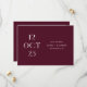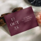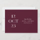 Comparte la fecha de tu boda con una elegante y romántica presentación utilizando esta tarjeta minimalista de "Save the Date" en vino oscuro (también conocido como ciruela borgoña). El llamativo diseño editorial de la fecha en la parte frontal hace una declaración visual refinada, mientras que en la parte posterior hay espacio para una foto completa de la pareja que añade calidez y personalidad. El rico tono vino aporta profundidad y sofisticación, lo que hace que este diseño sea una hermosa elección para bodas de otoño e invierno, celebraciones nocturnas, lugares de viñedos y estética romántica moderna. Personaliza los nombres, la fecha, la ubicación y la foto para hacerla tuya. Disponible tanto como tarjeta impresa como descarga digital.