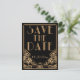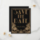 Un audaz y elegante anuncio de guardar la fecha de boda con estilo vintage con un tema "Gran Gatsby" de los años veinte rugientes en tonos negros y dorados. Un fondo negro resalta el intrincado borde geométrico de estilo Art Deco en tonos beige dorados. Se han seleccionado fuentes decorativas de estilo de época para la redacción de su evento.