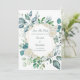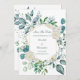 Bonitas rosas blancas con vegetación y hojas de eucalipto en esta boda, salven la tarjeta de cita. Elegante y formal.