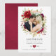 Tarjeta de aviso de boda con flores en tonos burdeos y rosa pálido diseñada para ser personalizada rápida y fácilmente según los detalles de su evento.