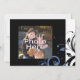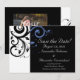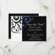 Tarjetas de invitación de boda negras modernas contemporáneas y llamativas con acentos de azul aciano y violeta pervinca blancos, con delicado fondo de hoja de voluta en espiral. Personalice en línea con los detalles de su boda.