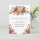 Sorprenda a sus invitados con esta elegante tarjeta de Save the Date que presenta hermosas flores de poinsettia rojas y hojas de pino rústicas.