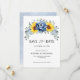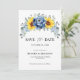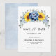 Tarjeta elegante y moderna de guardar fecha de boda floral de mediados de verano con un ramo de girasoles, hortensias y peonías en tonos de amarillo, pizarra y azul polvoriento con hojas botánicas verdes y eucalipto. Por favor, busque más diseños y variaciones en mi tienda "blissweddingpaperie". Y no dude en contactarme para personalizar o buscar artículos que coincidan.