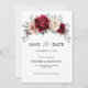 Tarjeta elegante de aviso de fecha para una boda con tema floral en rojo Burgundy, champán marfil y tonos terrosos, que incluye un ramo elegante de rosas y peonías de color Burgundy y champán marfil, y hojas de eucalipto en verde salvia. Por favor, póngase en contacto conmigo para cualquier ayuda en la personalización o si necesita algún otro producto con este diseño.