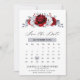 Elegante calendario de boda con tema rojo real blanco y plateado, tarjeta de aviso de fecha de guardado con un ramo elegante de flores de rosa rojas rubí real, carmesí, plateado, capullos de flores blancas puras y hojas de eucalipto. Por favor, contacte conmigo para cualquier ayuda en personalización o si necesita cualquier otro producto con este diseño.