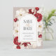Una romántica tarjeta Save the Date adornada con rosas rojas rubíes y flores blandas. Establezca el tono de su día especial con elegancia y encanto intemporal.