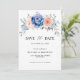 Tarjeta de aviso de boda floral rosa pastel azul marino que incluye un elegante ramo de azul marino, azul real, blanco, rosa pastel garden rose, hydrangea y hojas de eucalipto verde salvia. Por favor, contacte conmigo para cualquier ayuda en personalización o si necesita cualquier otro producto con este diseño.