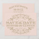 Cálida y romántica, esta invitación de guardar la fecha sin foto presenta un elaborado marco de florecimiento con volutas doradas sobre un suave fondo de melocotón rosa pálido con un reverso tipográfico a juego. El rico filigrana dorado contra el cálido rubor melocotón crea una paleta romántica y exuberante perfecta para celebraciones de primavera, verano o jardín. Todo el texto es totalmente personalizable.