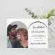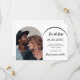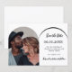 Una foto Guardar la tarjeta de fecha para su boda. En el frente: Añade tu propia foto de tamaño vertical dentro del marco de la foto del arco. Fondo blanco de moda, texto negro. Plantillas para nombres y fecha. El nombre y el texto: Guardar la fecha se escriben con un guión de estilo con letras a mano moderno. Atrás: puede agregar más texto si lo desea. Vaya a la herramienta de diseño y agregue la capa posterior.