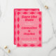 Un único borde ondulado enmarca esta boda grooval Guardar la fecha. Tipografía retro audaz y colores rosados y rojos para un aspecto único. La parte posterior de la tarjeta tiene el mismo borde curvado en rosa con un fondo rojo, con su monograma. un panel donde puede añadir más información, y un código QR para que los huéspedes puedan visitar su sitio web boda. Diseño: los colores de Jeannie: rosa, rojo y blanco roto