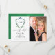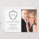Tarjetas de aviso de boda con monograma de cresta frondosa con tipografía de escritura a mano elegante personalizable con las iniciales de la pareja.