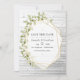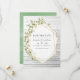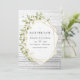 Invitación de boda rústica de granja con hojas de acuarela de color verde salvia y marco geométrico dorado. Ideal para cualquier tema o boda de jardín.