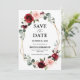 Tarjeta elegante y moderna de "save the date" romántico geométrico con acuarela floral que presenta un ramo de rosas de color burdeos / marsala, rosa sonrosado, púrpura y melocotón con follaje a juego. Perfecta para una boda de otoño o mediados de verano. Por favor, busque más diseños y variaciones coincidentes en mi tienda "blissweddingpaperie". Y no dude en ponerse en contacto conmigo para una mayor personalización o artículos coincidentes.