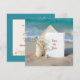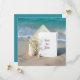 Una tarjeta de invitación de boda en blanco está elegantemente colocada contra un fondo de playa, acompañada de delicadas flores de gypsophila blancas, una estrella de mar y una moneda de arena.