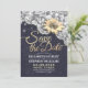 Guardar la fecha Plantillas de tarjeta de invitación de boda - Elegantes girasoles, marco de encaje vintage y luces de cadena chic en fondo azul marino.