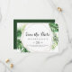 Este destino geométrico de la boda horizontal tropical ahorra la fecha es perfecto para un boda verde. El diseño se compone de palmeras verdes de color agua pintadas a mano y hojas de plátano cuidadosamente dispuestas en bonitos ramos, adornando un marco geométrico dorado.