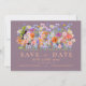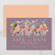 Impresionante invitación de boda para guardar la fecha con flores silvestres y follaje pintados a mano en acuarela en tonos de melocotón, ciruela, azul caramelo, azul de aciano, azul marino, púrpura, rosa, amarillo, rojo, burgundy, magenta y verde. Personalice las iniciales del monograma de la novia y el novio en el reverso de la invitación. Ideal para una invitación única para guardar la fecha de una boda de primavera o verano. La tipografía moderna y elegante en melocotón complementa el hermoso y caprichoso arte boho que incluye acianos, amapolas, cosmos, nomeolvides, margaritas, billy button y delicado follaje. Elegantes invitaciones de boda bohemias chic perfectas para una boda en un prado primaveral o un jardín de verano. Arte original de la artista
