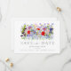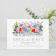 Impresionante invitación de "save the date" de boda con acuarelas pintadas a mano de flores silvestres y follaje en tonos rosa, azul cielo, azul marino, púrpura, rosa, amarillo, rojo, burdeos, magenta y verde. Personalice las iniciales del monograma de la novia y el novio en el reverso de la invitación. Ideal para una invitación "save the date" de boda única para una boda de primavera o verano. La tipografía moderna elegante en gris pizarra complementa la hermosa obra de arte boho caprichosa que incluye acenorias, amapolas, cosmos, nomeolvides, margaritas, botón de oro y delicado follaje. Chic invitaciones de "save the date" de boda bohemio perfectas para una pradera de primavera o boda de jardín de verano. Arte original de la artista Catherine Sweetman