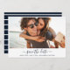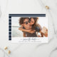 Haga que sus invitados se entusiasmen con su boda con esta moderna foto, ahorre la tarjeta de fecha, perfecta para su boda en la playa. Comparte un momento especial de tu relación y asegúrate de que tus invitados guarden la fecha. Personalizar guardará la fecha con su foto, nombres, fecha de boda y ubicación. Vuelve a un diseño de franjas náuticas en la parte posterior.