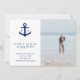 Foto náutica: guarda las fechas con tu foto vertical favorita a la derecha. A la izquierda hay un ancla azul marino con un monograma a cada lado. Debajo están sus nombres y las palabras, "están atando el nudo", sobre un fondo blanco. El reverso es una sombra de azul marino. Este sencillo diseño es perfecto para una boda en la playa en verano.