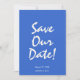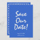 Esta moderna y retro funky Boda minimalista Guardar la plantilla de fecha es genial para usted. Si busca una boda bonito, elegante y fácil de personalizar, guarde la plantilla de fecha. Una plantilla sencilla y muy elegante. Que presenta un brillante fondo azul brillante con tipografía escrita a mano blanca lechosa. Y los corazones dibujados a mano se enmarcan. Agarra esta elegante boda, ahorra la fecha y haz que tus invitaciones estén realmente comprometidas.