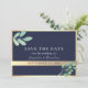 Esta invitación moderna de boda boho para guardar la fecha combina elementos rústicos elegantes con un esquema de color dorado y azul marino. Adornada con vegetación de eucalipto pintada a la acuarela y una sencilla tipografía caligráfica, emana encanto botánico y sofisticación, asegurando que tu día especial sea recordado con estilo.