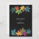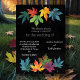 El diseño de esta tarjeta boda presenta una sorprendente disposición de hojas de otoño coloridas, representadas en un estilo minimalista contra un fondo negro sólido. Las hojas, en tonos verdes, naranjas, amarillos, azules y púrpura, están repartidas artísticamente en dos grupos (uno en la parte superior y otro en la parte inferior de la tarjeta), creando un marco natural para el texto. Los colores vivos de las hojas le dan un toque alegre y festivo a la carta, mientras que el fondo negro le da un toque elegante y moderno. Este diseño es perfecto para un boda con temática de otoño, que combina la belleza de la naturaleza con elementos de diseño contemporáneo. Personalice la tarjeta con sus nombres y detalles del boda. Puedes descargar la tarjeta en tu equipo móvil o computadora. Tarjeta creada con ayuda de ai.