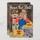 Boda de otoño rústica salva la tarjeta de fecha. Cuto otoño Scarecrows Bride y Groom Wedding Salven la fecha con calabazas, heno, rústico estilo de madera de granero. Informe a los clientes de su boda que guarden la fecha de su boda de Noviembre en otoño próximo. Creado por Bodas © Lesruba.