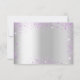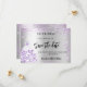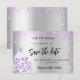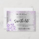 Un fondo moderno con apariencia de plata decorado con purpurina falsa morada, destellos y un vestido. Personalice y agregue una fecha y nombres. El texto: Save the Date está escrito con una fuente de letra grande y de moda con estilo caligráfico.