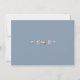 Diseño romántico y elegante con delicados ramos de flores de acuarela en azul polvoriento y rosa brumoso, marco dorado precioso, sobre fondo azul polvoriento. En la parte trasera, un ramo de rosa brumoso azul polvoriento con flechas como divisor, y las iniciales de la novia y el novio. Utilice la herramienta Personalizar para agregar su información. Para artículos coincidentes, visite mi Colección de Flores Azules Doradas.