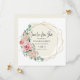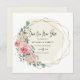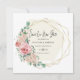 Una manera elegante de hacer saber a amigos y familiares que has reprogramado a tu boda. Un marco geográfico dorado rodea los detalles de fecha de su boda. El fondo beige suave resalta el texto. Save Our New Date se escribe en un guión moderno, con detalles a continuación. Las rosas rosas rosas rosas y las flores de hidrangea están enclavadas en hojas de follaje verdes decoran el marco geométrico de oro. El guardar nuestra nueva tarjeta de cita es beige.