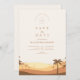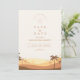 Disfrute del cálido romanticismo de una puesta de sol tropical del desierto con este minimalista diseño boda de inspiración retro. Este estilo, con dunas en suave pendiente y palmeras con silueta en tonos de siena y melocotón quemados, evoca un sueño paraíso del desierto perfecto para bodas de inspiración boho o destino. El degradado nostálgico y la disposición moderna combinan el encanto del desierto costero con la elegancia atemporal.