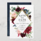 Hermosas flores boho boda guardar la fecha cuenta con gráficos florales pintados a mano acuarela / rosas en tonos ricos de rojo Borgona Marsala azul marino y rosa suave / melocotón y fuente de estilo de letra a mano encantadora. Por favor, póngase en contacto conmigo para obtener ayuda en la personalización o si necesita algún otro producto con este diseño.