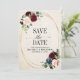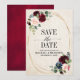 Tarjeta de "save the date" de boda floral rústica campestre elegante con acuarela en rojo burdeos, rosa y azul marino con follaje botánico verde y hojas de eucalipto sobre fondo burdeos oscuro. Este hermoso diseño fácil de personalizar puede coincidir fácilmente con los colores, estilos y tema de su boda y es una opción perfecta para bodas campestres de otoño, mediados de verano o invierno. Puede encontrar más diseños coincidentes en mi tienda o contactarme si necesita ayuda para personalizar el diseño.