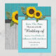 Invitación de boda campestre moderna encantadora con madera azulada y girasoles dorados, perfecta para las bodas de este año
