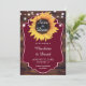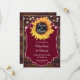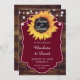 Boda rústica y personalizado de Borgoña salva la tarjeta de cita con girasoles y luces de cuerda sobre un fondo de madera de granero.