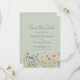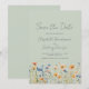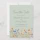 Este diseño rústico boho presenta un borde de acuarela de flores silvestres naranjas y azules en la parte inferior. Las palabras "Guardar la fecha" y los nombres de la pareja aparecen en elegante letra manuscrita gris carbón, con el texto restante en fuente sans serif sobre un fondo verde salvia.