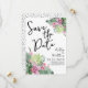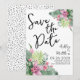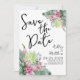 Un diseño tropical que abraza la belleza tranquila de la naturaleza mezclada con un toque juguetón que seguramente te ayudará a divertirte. Una mezcla de calmantes hojas tropicales verdes, incluyendo hojas de plátano, palmas, hojas de monstera y plantas de princesa rosa, junto con flores de orquídea púrpura-rosa y flor de protea, entrelazadas con varios otros follajes. Añadiendo un elemento de diversión, un fondo negro de 'punto desordenado' o 'punto dálmata' en la parte posterior infunde el diseño con un toque juguetón (puedes quitarlo si lo deseas). Mejorado por una fuente manuscrita moderna, esta impresión encantadora irradia encanto y sofisticación. Este diseño versátil trae un sentido de paraíso tropical a cualquier entorno u ocasión especial, lo que lo hace perfecto para una boda de destino, o simplemente cuando deseas agregar un toque tropical. Boda floral tropical acuarela palma verde rosa Guarde la fecha